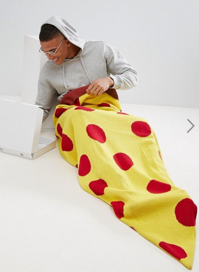 Gelukkig zijn er veel pizzafans met ons. En dat zorgt ervoor dat er ook onwijs veel pizza-merchandise op de markt is. Van handige zakjes om je pizzapunten in mee te nemen tot aan telefoonhoesjes en sokken met een pizza erop afgebeeld. ASOS doet een duit in het Britse zakje, met de 'ASOS pizza blanket'. Het idee is doodsimpel: het is een reusachtige sok in de vorm van een pizzapunt, waar je overheerlijk in kunt kruipen wanneer je genesteld hebt op de bank.