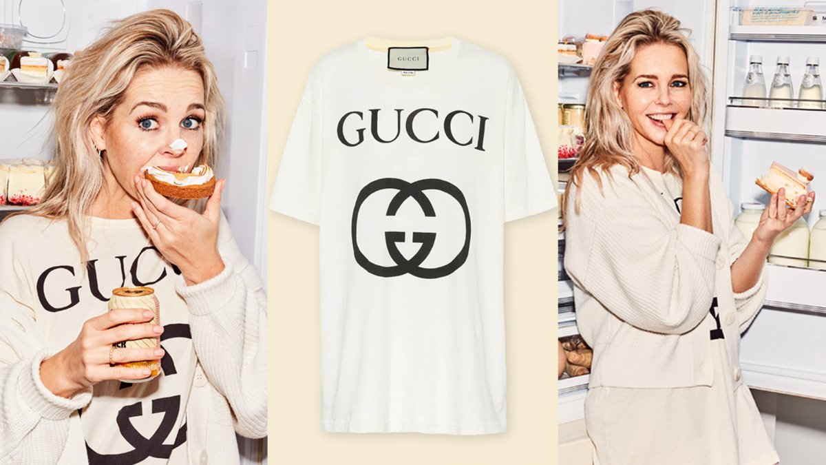 Ja, het stuk taart dat Chantal in haar hand heeft op de cover van het januarinummer is ook to die for. Maar we geven iets nóg leukers weg: het oversized Gucci-shirt dat Chantal onder haar gebreide vest draagt.