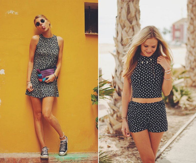 De allereerste ontwerpen waren simpele setjes (een kort broekje en een croptop) van stoffen met leuke printjes, gekocht op de Noorder- of Dappermarkt in Amsterdam, waar we iedere week samen naar toe gingen. We begonnen deze setjes te verkopen via de Facebookgroep ‘Kleding aangeboden/gezocht’ voor een klein prijsje. Dit ging al snel als een lopend vuurtje door Amsterdam, heel veel meisjes wilde wel zo’n Daylliance setje. Maar de zomer ging voorbij en we moesten nieuwe dingen verzinnen. Vintage spijkerjacks met handgeschilderde, toffe teksten, bedrukte truien en zelfgemaakte flared pants it was. Ook deze items verkochten goed, maar wij wilden meer. De ideeën die we hadden, waren te moeilijk om zelf uit te voeren op de naaimachine, dus gingen we, met het geld dat we inmiddels hadden verdiend, op zoek naar een mogelijkheid om onze ideeën te laten uitvoeren door een producent over de grens.