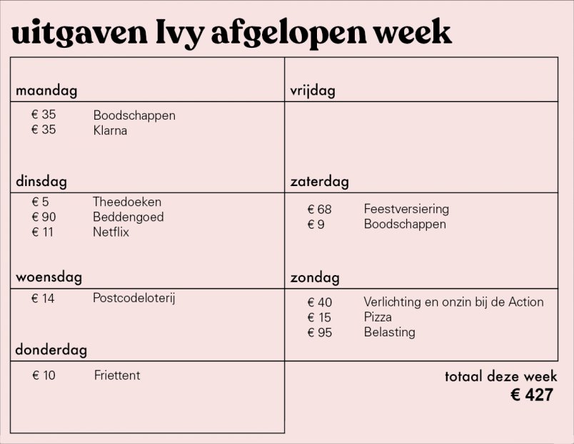 In onze rubriek Poenpraat praten we over poen. Cash. Knaken. Doekoe. Over geld dus. Elke week vertelt een lezer hoeveel diegene de afgelopen week heeft uitgegeven en waaraan. Deze week loeren we in het huishoudboekje van Ivy.