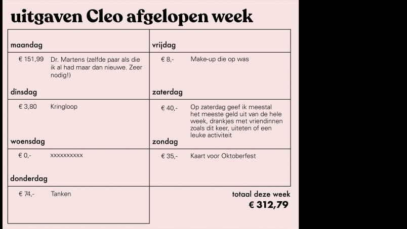 In onze rubriek Poenpraat praten we over poen. Cash. Knaken. Doekoe. Over geld dus. Elke week vertelt een lezer hoeveel diegene de afgelopen week heeft uitgegeven en waaraan. Deze week loeren we in het huishoudboekje van Cleo.