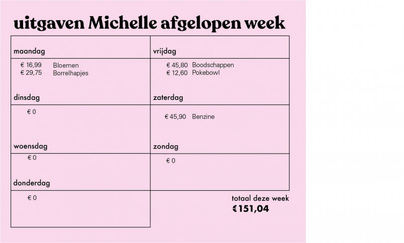 In onze rubriek Poenpraat praten we over poen. Cash. Knaken. Doekoe. Over geld dus. Elke week vertelt een lezer hoeveel diegene de afgelopen week heeft uitgegeven en waaraan. Deze week vertelt Michelle waar ze haar knaken aan uitgeeft.
