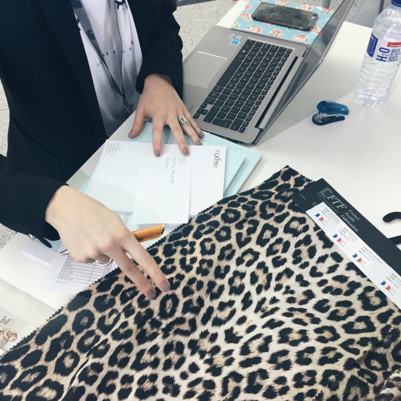 De volgende dag starten we vol goede moed (en een lichte kater) aan de beurs. De ene helft van het vliegveld, waar de beurs plaatsvindt, hangt vol met stoffen. De andere helft met kleding. Voor sommige klinkt dit wellicht als een nachtmerrie, voor ons is dit paradijs. De hele dag neuzen we tussen alle stoffen met printjes. Van tijgers tot lipjes, van oogjes tot streepjes, you name it. Nou begint zakelijk contact vaak met het uitwisselen van visitekaartjes. Maar dan moet je die wel bij je hebben. Fuck. Vergeten. Lekker professioneel. Dan maar shinen met ons Instagram account. Als het Chantal Janzen opvalt (lees: Chantal vond ons op Instagram wat resulteerde in deze blog) dan valt het vast ook in de smaak bij de stoffenhandelaren. Chantal Janzen kende ze niet, maar onze 10k volgers maakte wel indruk.