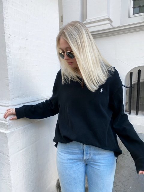 'Deze trui heb ik gekocht via @lilymoonlabel op Instagram. Zij verkoopt voornamelijk tweedehands Ralph Lauren items. De laatste tijd probeer ik vooral te letten op duurzaamheid. Ik denk na over wat en waar ik iets koop. Maar niet alleen daarom, want ik vind de oversized fit ook heel leuk.'