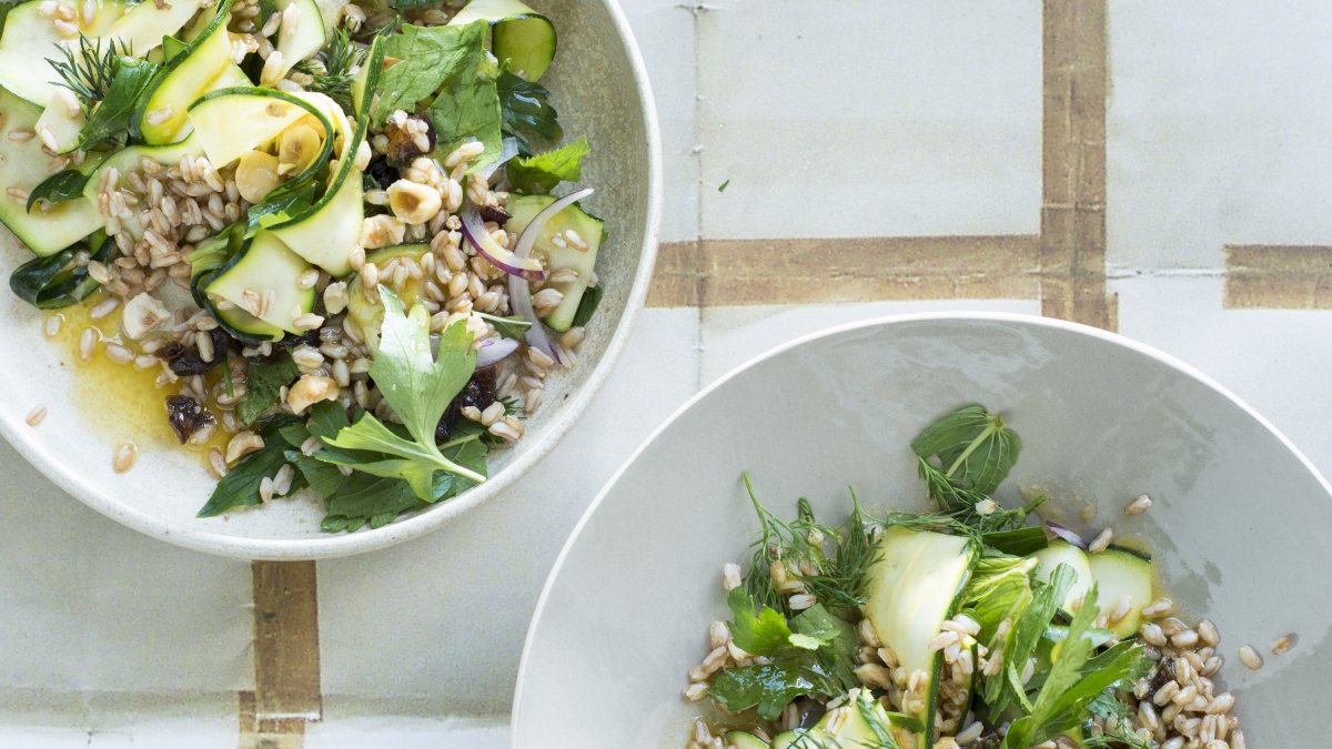 4. Voeg de gekookte farro toe aan de courgettes, ui en pruimen. Scheur de kruiden klein, voeg ze samen met de dressing toe aan de salade en schep alles voorzichtig door elkaar.