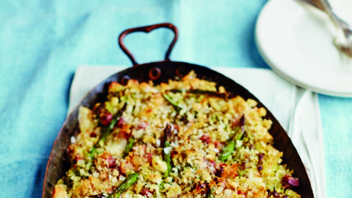 7. Verdeel de aspergetopjes en de pancetta erover, schenk de rest van de aspergepuree erover en bestrooi met de rest van de provolone. Zet in de oven en bak 20 tot 25 minuten, tot er een mooie goudgele korst ontstaat. Strooi het broodkruim erover en snijd in rechthoekige stukjes. Serveer warm of koud.