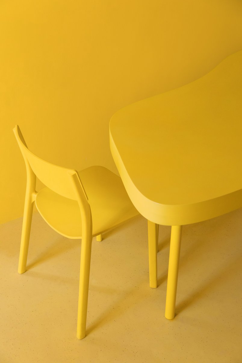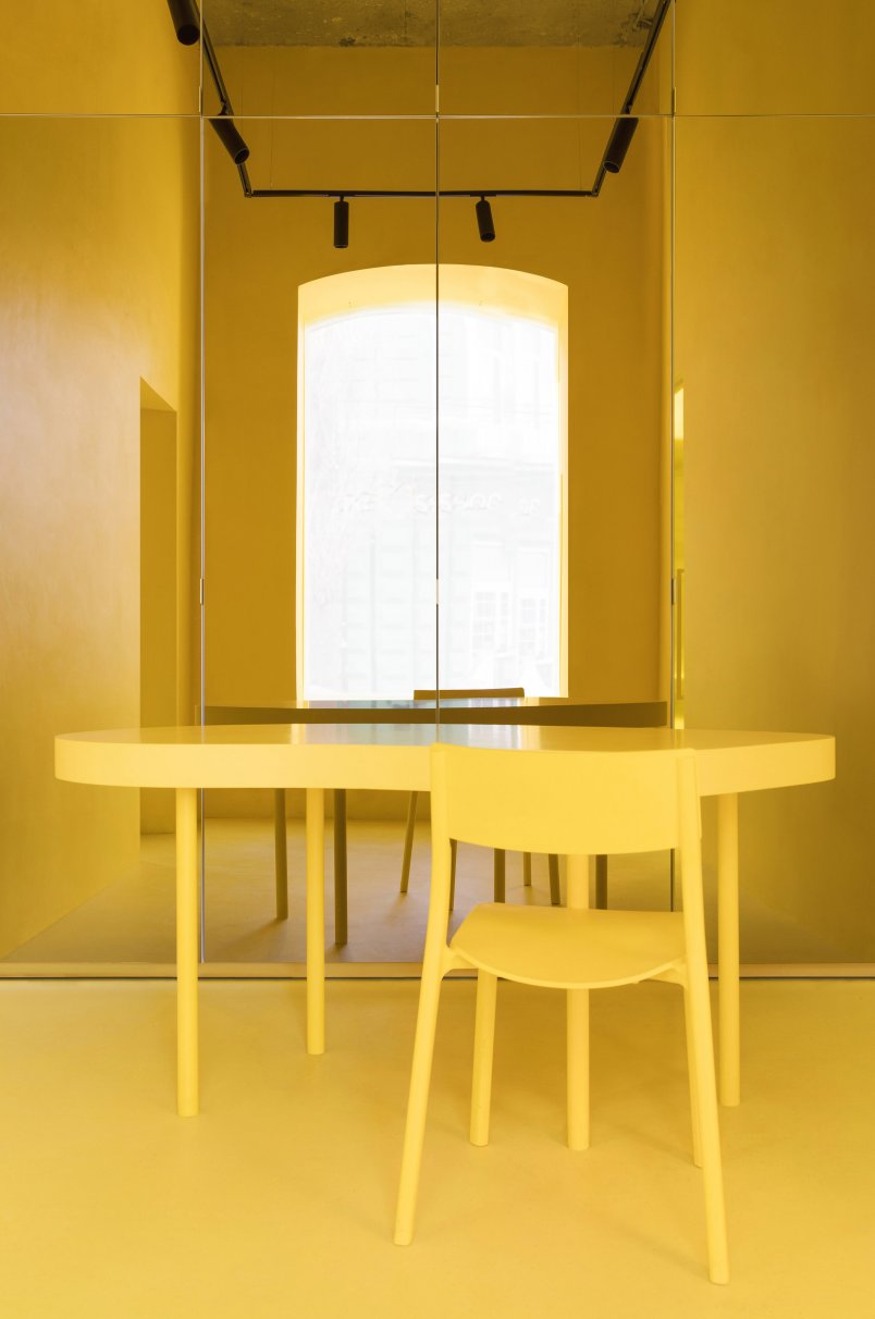 Het lijkt wel een filmset of een museumdecor: de kanariegele winkelentree is van boven tot onder gehuld in de verfkleur ‘cyber yellow’. Best slim om alles in één kleur te verven, want daardoor lijkt de ruimte veel groter dan hij is. Probeer het thuis maar eens, als je durft. Ook het gebruik van spiegels helpt hierbij, een oplossing met een iets kleinere shockfactor. De felle ruimte verwijst naar het werk van lichtkunstenaar James Turrell, die niet anders doet dan geweldige, kleurrijke, met (neon)licht gevulde ruimtes creëren.