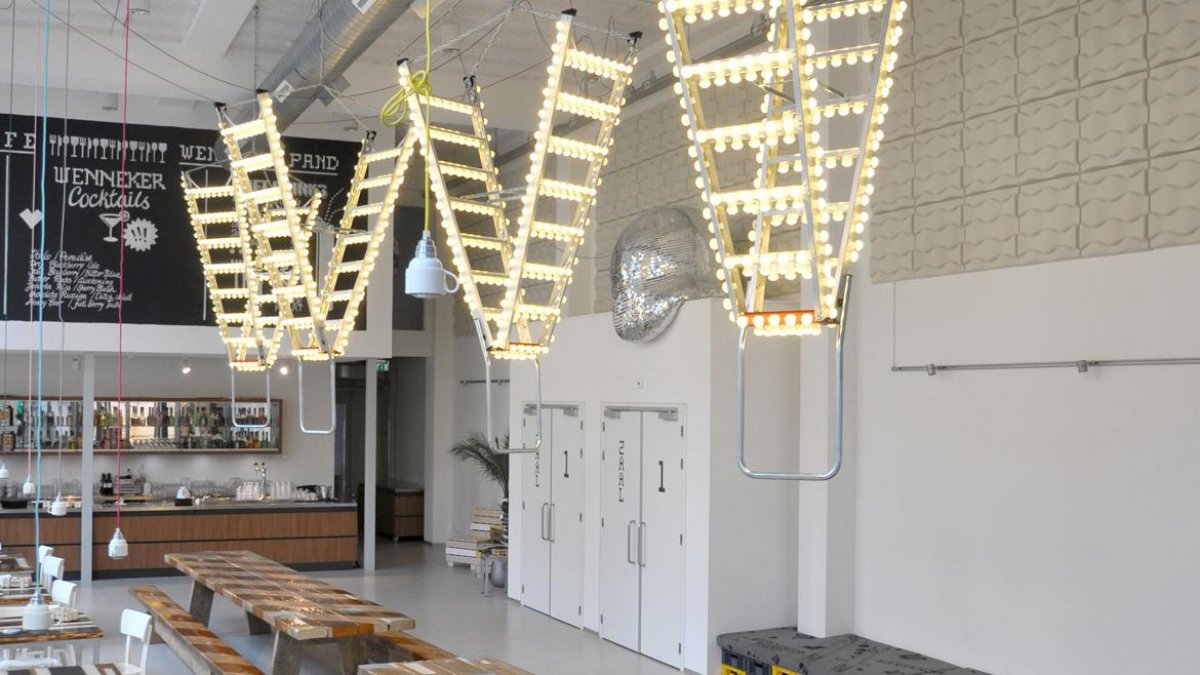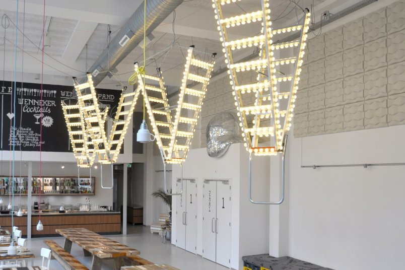 Een suffe veiligheidsladder weer cool maken? Ontwerper Bertjan Pot deed het. Toen een doodgewone ladder, om praktische redenen besteld voor de designstudio, tegelijkertijd arriveerde met de kermisverlichting voor een ander project was het 1 + 1 = 2. Et voilà, de fonkelende ‘Stairway to Heaven’-lamp was geboren en evolueerde tot de ‘Downstairs’-trap (verkrijgbaar via DHPH).