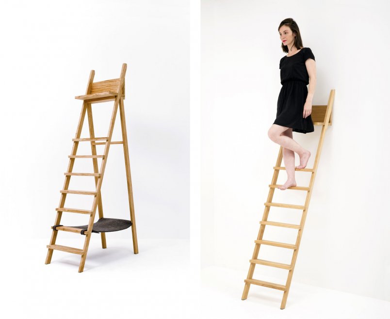 Even vanuit een heel ander perspectief naar je eigen woonkamer kijken? Beklim de ‘Belvedere’-ladder van ontwerper Pierre-Emmanuel Vandeputte om van grote hoogte je woning te overzien. De ladder kan op zichzelf staan als een soort badmeesterstoel, of je laat hem nonchalant tegen de muur leunen.