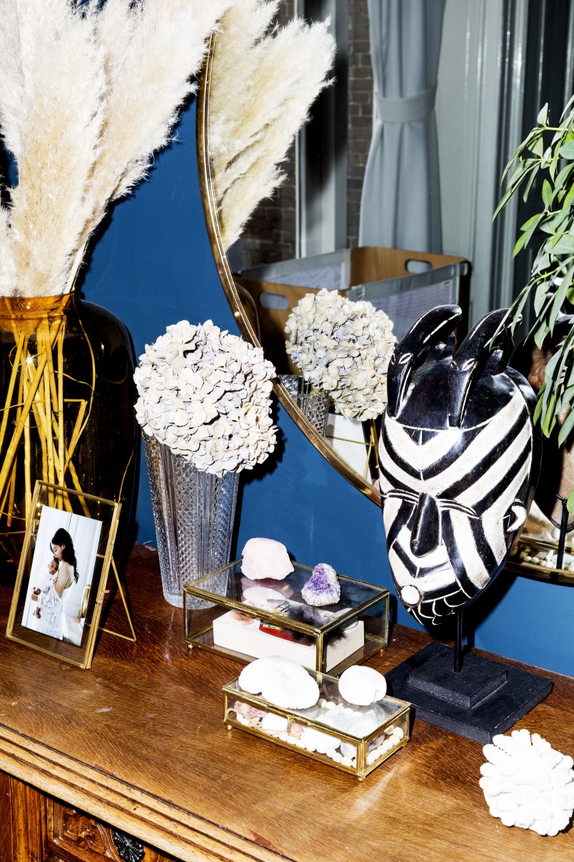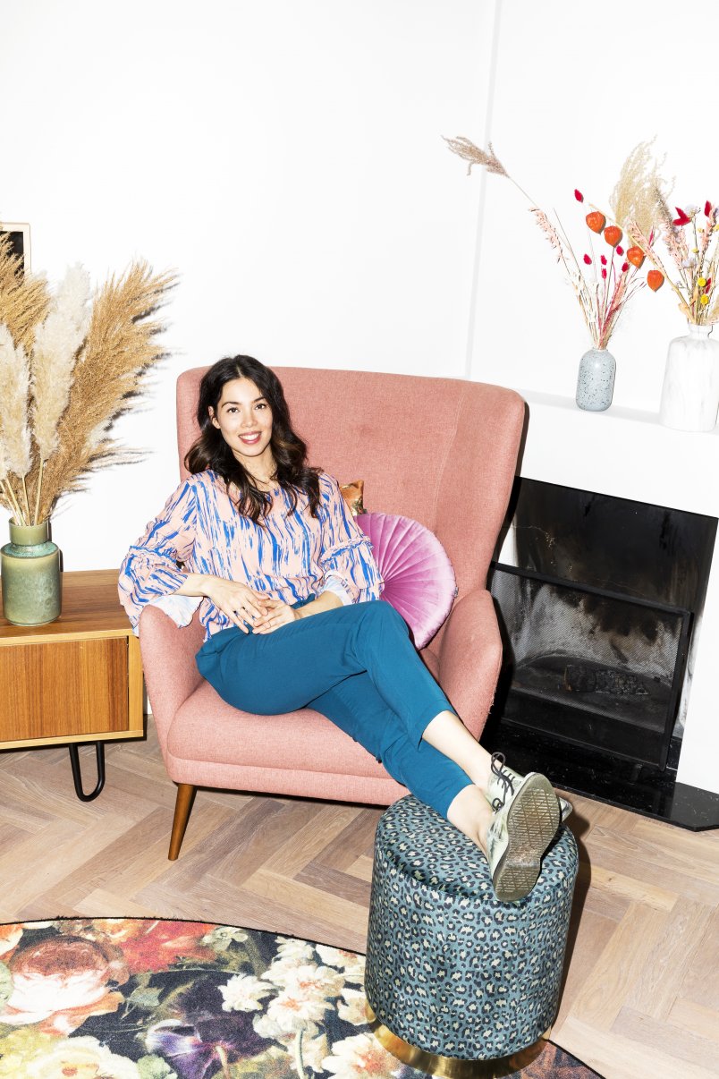 ‘Het eerste wat ik kocht, was het ronde vloerkleed met bloemen. Dat vormde meteen een handig kleurenpalet voor de muren. De mix van botanische prints en patronen vind ik heel leuk en velours is echt mijn stof. Mijn tip aan iedereen: ga niet meteen als een gek spullen kopen, maar ga eerst in je huis wonen. Onze bank van Fést wordt door de kat gebruikt als krabpaal, onze zoon Oliver spuugt erop en ik vind de grijze kleur te licht. Zonde, want de bank was vijfduizend euro. De volgende die we kopen, wordt een goedkoper exemplaar. Verlichting vind ik wel de investering waard, die slijt niet. Marcel Wanders heeft voor Moooi een zwarte statementlamp ontworpen die bij ons boven de eettafel hangt, net een kunstwerk.’
