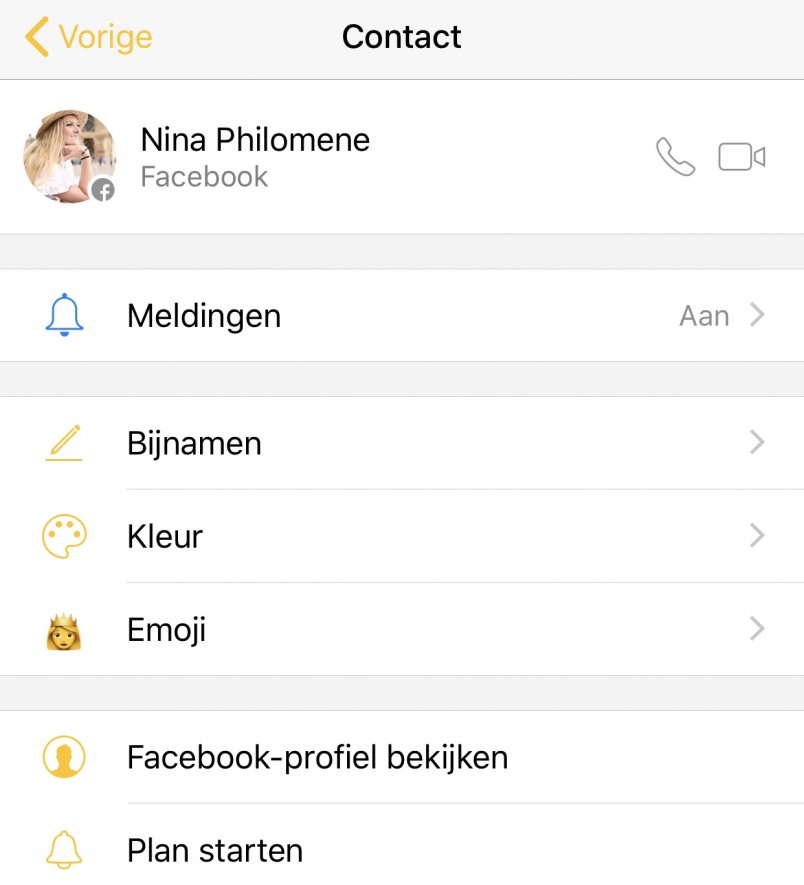 Wil jij je gesprekken écht persoonlijk maken? Dan kun je alles volledig customizen in Facebook Messenger. Dit doe je door op het desbetreffende gesprek te tikken. Vervolgens tik je op de naam van de persoon of de groep. Hier kun je iedereen een ‘Bijnaam’ geven, het gesprek een kleur geven en de ‘like’-emoji vervangen voor een emoji die bij deze vriend past.