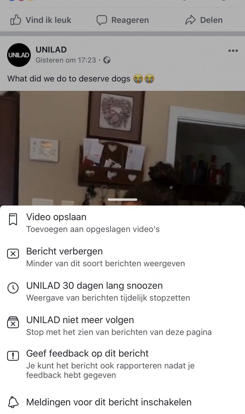 Een van mijn favoriete functies in Facebook is het opslaan van posts. Stel, je bent door je Facebookfeed aan het scrollen en je komt een interessant artikel tegen of een recept. Iets dat je graag wilt onthouden. Dan kun je dit opslaan door op de drie stipjes rechtsboven te tikken. Je kiest dan voor ‘Bericht opslaan’. Zo kun je op een later moment - als jij er tijd voor hebt - deze berichten lezen. Je vindt ze onder het kopje ‘Opgeslagen’. Handig!
