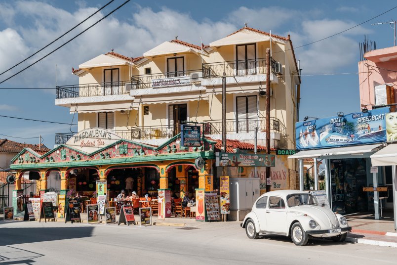 Onderaan de heuvel van de luxueuze resorts ligt het Tsilivi, een dorpje waar je je prima kunt vermaken. Het heeft een heerlijk strand en gezellige beach bars. Even geen zin in muziek en cocktails? In het dorpje vind je ook leuke taverna’s en rustige cafés. De bekendere en grote stranden als Porto Zorro, Banana Beach, Plaka en St. Nicolas Bay liggen even verderop, vlak bij het dorp Vassilikos. Laganas, in het zuiden van Zakynthos, is ongetwijfeld de bekendste badplaats. Een modern stadje met veel cafés en uitgaansgelegenheden, dat volledig op het toerisme is ingericht. Hier vind je brede stranden met heerlijke ligbedden en goede restaurants aan de boulevard. Onze favoriet: Cool Peppers. Wil je de zenmodus liever vasthouden? Er zijn genoeg rustige strandjes in de buurt waar dat lukt. Cameo Island, net voor de kust van Laganas, bijvoorbeeld. Een klein paradijs met beach bar, dat je vanuit de verte al herkent aan de wapperende witte doeken.