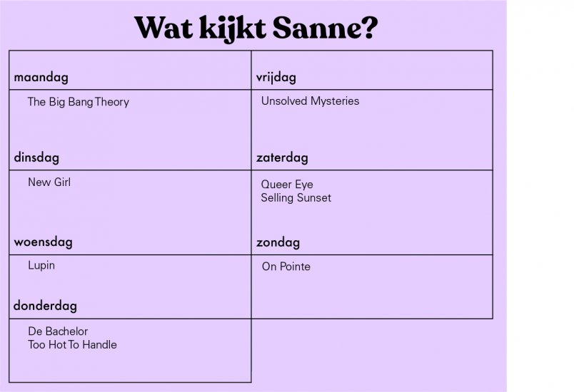 Minimaal twintig uur van je week besteden aan je favoriete serie? En niet kunnen stoppen met praten over die film die je net ontdekt hebt? In Wat kijk jij? vragen we een lezer het hemd van het lijf over haar kijkgedrag. Gewoon, omdat we dat leuk vinden. Deze week loeren we in de kijkgeschiedenis van Sanne.