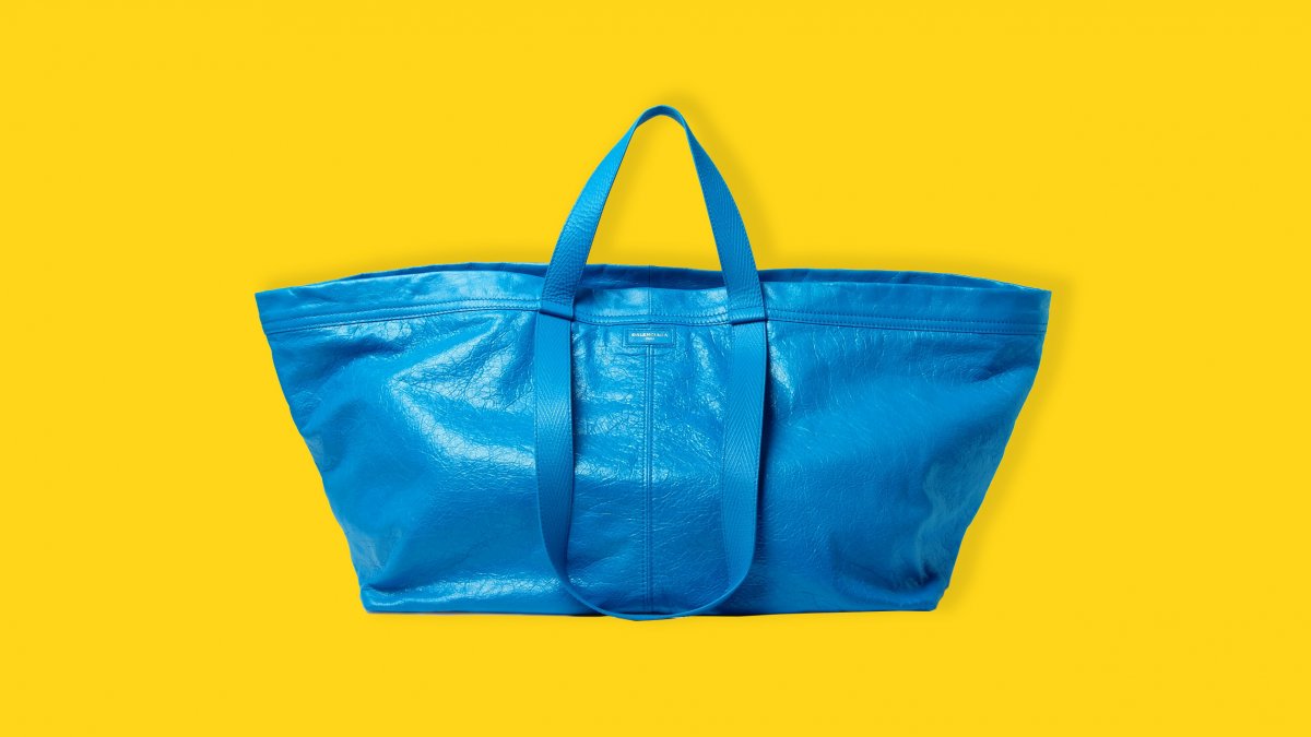 Demna Gvasalia, artistiek directeur bij Balenciaga en head designer bij Vetements, vindt realiteit het belangrijkste ingrediënt in zijn creaties. En in de realiteit gaan wij massaal naar Ikea om de welbekende blauwe tassen vol te laden met RIBBA's, KLIPPAN's en LACK's. Of nog realistischer; stouwen wij de FRIKTA (zo heet 'ie dus) vol met was of boodschappen, gebruiken we 'm als verhuisdoos of lege-flessen-tas, staan er zes exemplaren op zolder met winterdekbedden en ik-wil-het-niet-weggooien-maar-ook-niet-meer-hebben-spullen. Een allemansvriend die tas, moet Gvasalia gedacht hebben. Alleen het blauwe zeil is vervangen voor het signature creased leather van Balenciaga. Oh, en het prijskaartje is overigens ook aangepast; bij Ikea betaal je 60 cent voor de tas, Balenciaga vraagt er $2.145 voor. Couture is nou eenmaal niet voor het klootjesvolk. En dat is de realiteit.