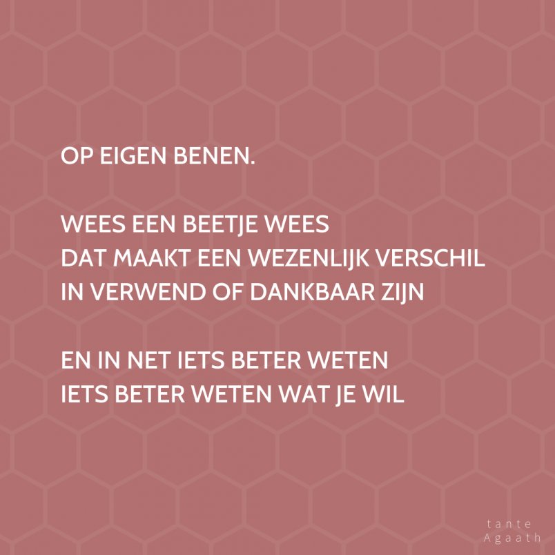 Ze zingt zachtjes of vol volume, ze kickt waanzinnig op een groot publiek, maar soms blijft ze ook liever anoniem. Grote dromen, en kleine stappen in de goede richting. Op weg naar wie Judith is probeert ze zo veel mogelijk te doen. Naast dat ze goed kan zingen ontwikkelt ze de laatste tijd ook steeds meer haar tekstuele kant. Als 'Tante Agaath' dicht ze nu 80% van de tijd, maar gelukkig kan ze zelf haar tijd in delen, en heeft ze genoeg tijd om nog te zingen. Op haar website kun je vinden wat Judith allemaal doet, en waar zij jou blij mee kan maken. Hieronder alvast een voorproefje van haar leuke korte gedichtjes.